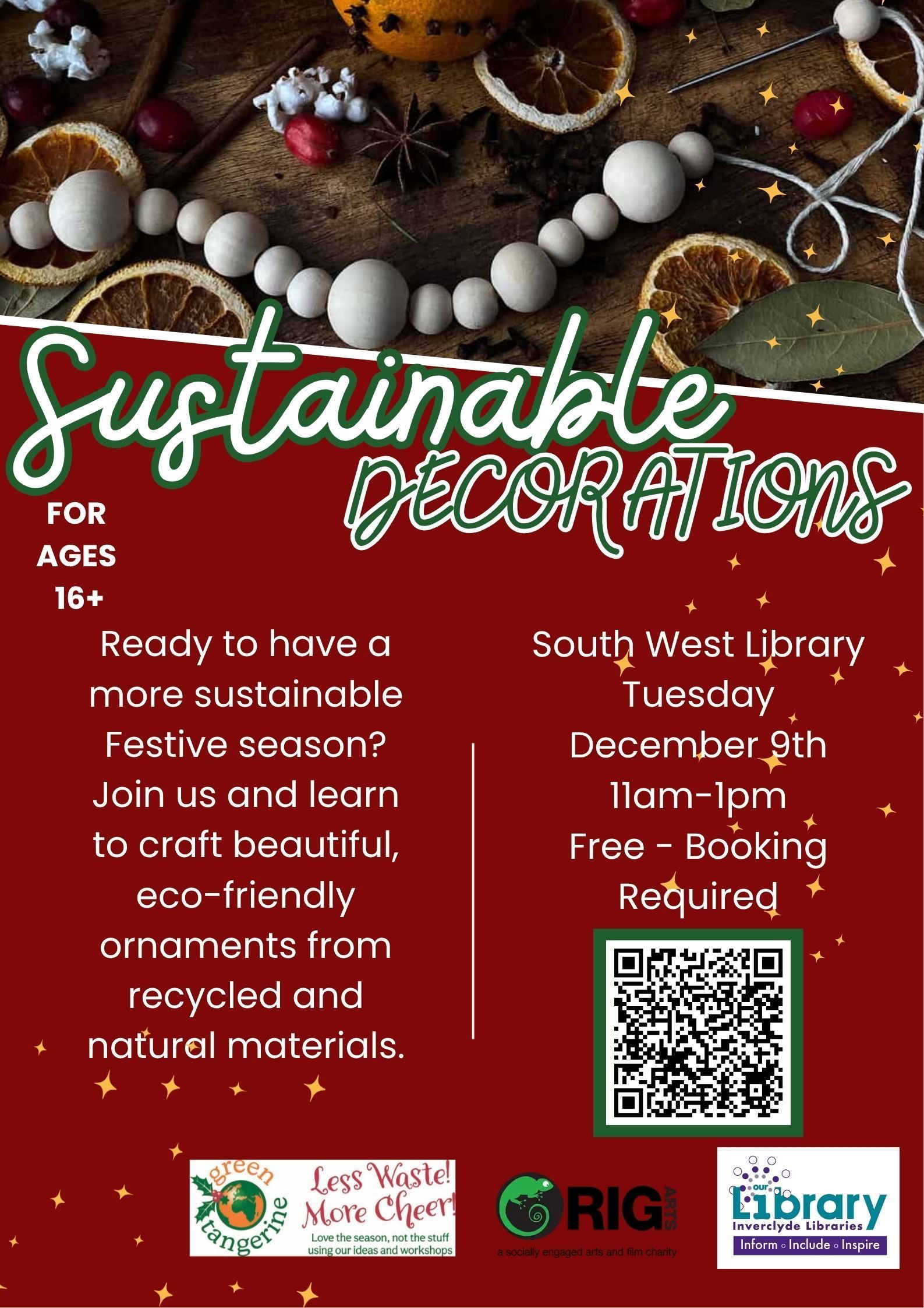 | Tuesday 9th December | 11-1 | South West Library | Workshop - Making Sustainable Decorations (16 years and over) by RIG Arts/Drying Green and Inverclyde Libraries. Free but booking required. | Book your ticket: eventbrite.co.uk/e/sustainable-decorations-workshop-tickets-1828105535869?aff=oddtdtcreator | |